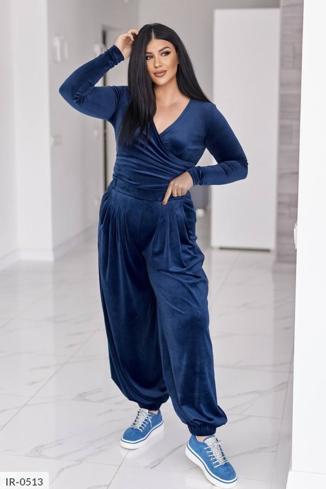 Стильний жіночий костюм у трендових відтінках, що поєднує комфорт і витончену жіночність. Виконаний з мякого, приємного до тіла велюру з легким благородним блиском, який красиво переливається при русі.