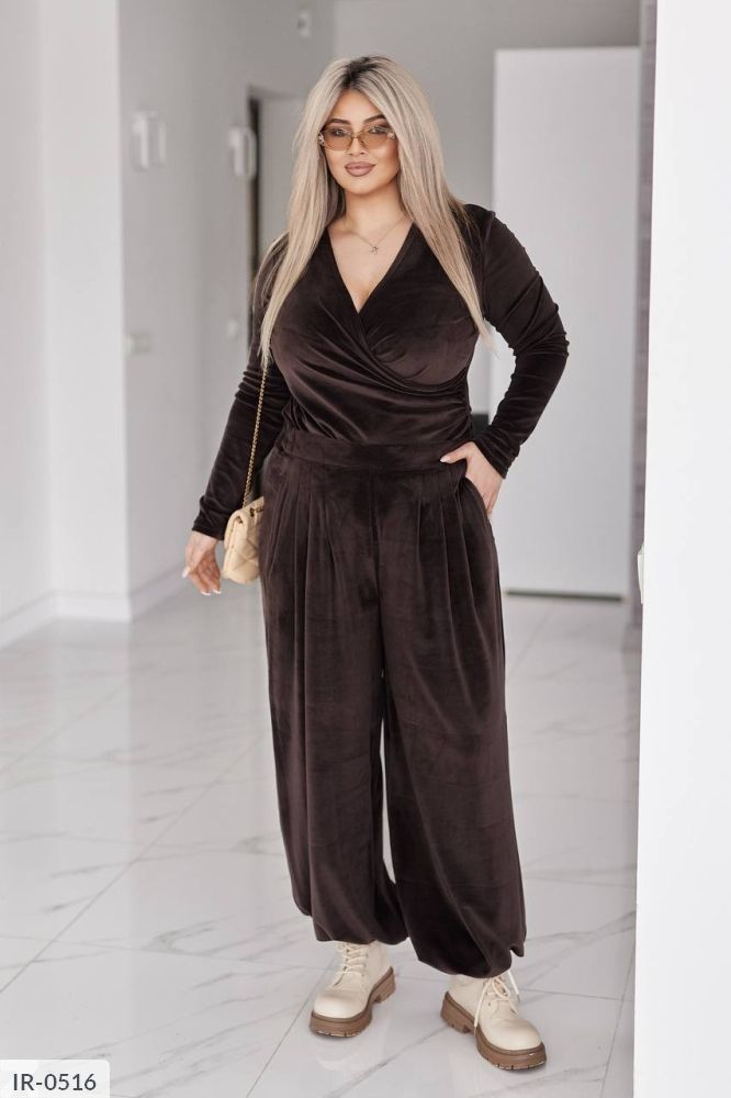 Стильний жіночий костюм у трендових відтінках, що поєднує комфорт і витончену жіночність. Виконаний з мякого, приємного до тіла велюру з легким благородним блиском, який красиво переливається при русі.