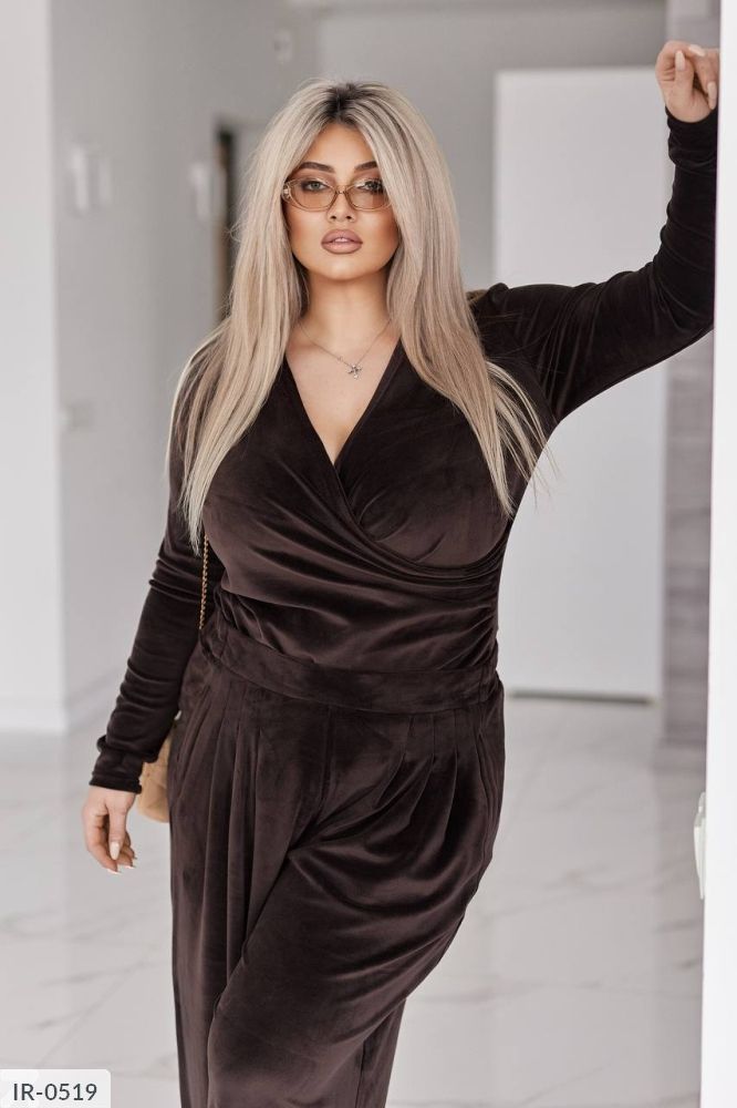 Стильний жіночий костюм у трендових відтінках, що поєднує комфорт і витончену жіночність. Виконаний з мякого, приємного до тіла велюру з легким благородним блиском, який красиво переливається при русі.