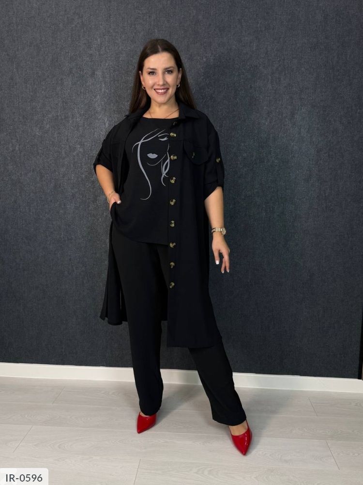 Костюм-трійка з оригинальним накатом, всі три деталі гардеробу можливо носити окремо: блуза з якісним накатом, як на фото, по низу з обох боків розрізи, брюки на широкій резинці, з боків кишені, подовжена сорочка, застібається на ґудзики, рукав на патику с ґудзиком ( довжину можливо регулювати), на грудях неробочі кишені с ґудзиком, з боків сорочки робочі кишені. Параметри моделі інни 103-83-106, зріст 165см, на ній одягнений размер 50-52