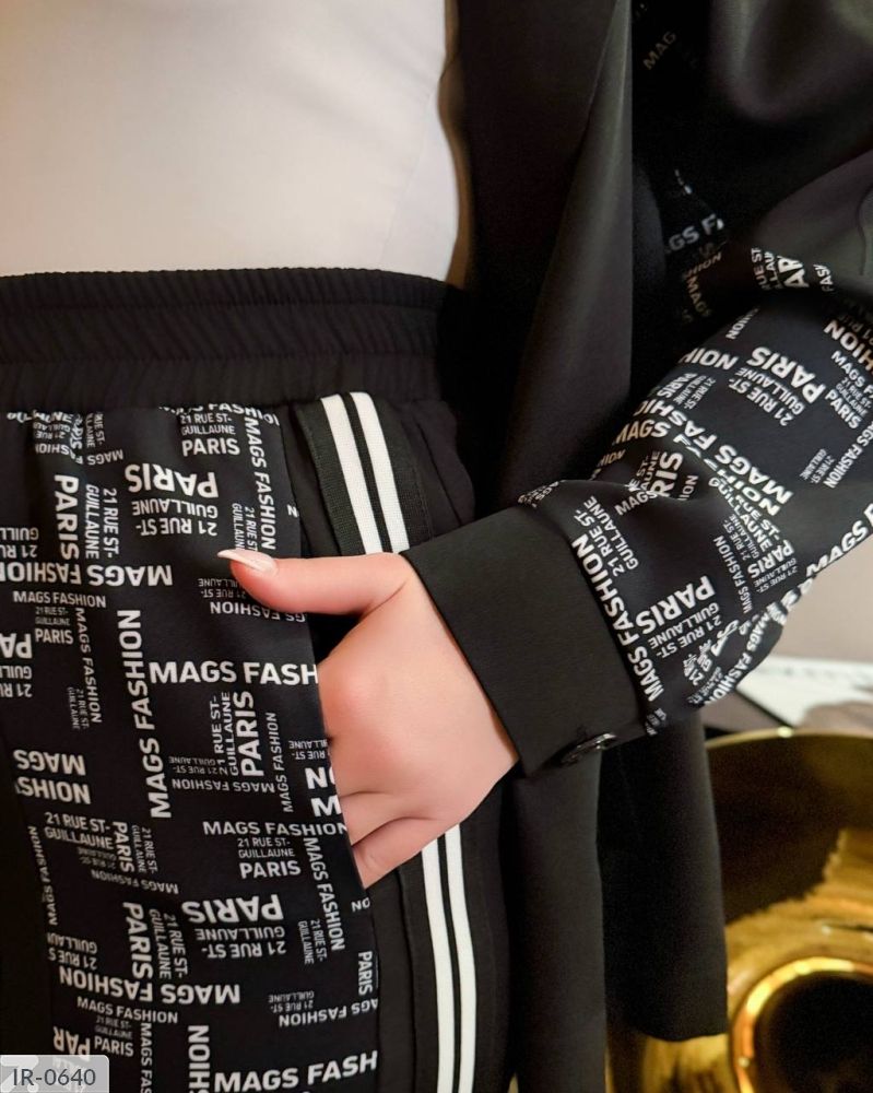 Костюм-двійка цікавого крою: на рукавах та штанках принтовані вставки + пришивний лампас. Жакет застібається на два ряди ґудзиків, на рукавах манжети з ґудзиками. Штани на резинці, з боків кишені.
