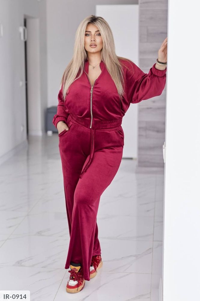 Велюровий оксамитовий костюм складається з кофти і штанів. Кофта вільного крою oversize, з застібкою блискавкою і коміром стійкою. В рельєфних швах спереду є кишені. Рукав зі спущеною лінією плеча, манжети на рукавах та низ кофти на еластичній широкій резинці.