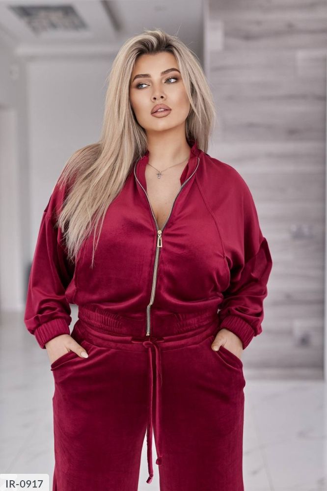 Велюровий оксамитовий костюм складається з кофти і штанів. Кофта вільного крою oversize, з застібкою блискавкою і коміром стійкою. В рельєфних швах спереду є кишені. Рукав зі спущеною лінією плеча, манжети на рукавах та низ кофти на еластичній широкій резинці.