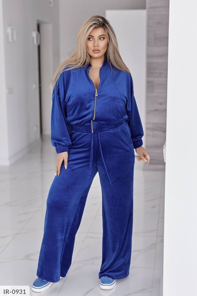 Велюровий оксамитовий костюм складається з кофти і штанів. Кофта вільного крою oversize, з застібкою блискавкою і коміром стійкою. В рельєфних швах спереду є кишені. Рукав зі спущеною лінією плеча, манжети на рукавах та низ кофти на еластичній широкій резинці.