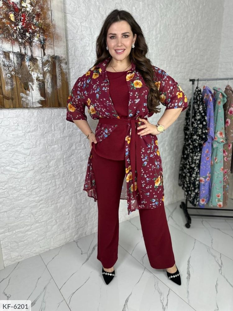 Костюм-трійка, всі три деталі гардероба можливо носити окремо: на блузі з обох сторін розрізи, штани-кльош на широкій резинці, з боків кишені, подовжена сорочка з шифону ( без гудзиків), фіксується на талії поясом.