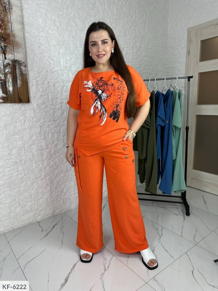 Костюм-двійка Кольори: помаранчевий, хакі, фісташка, джинс Тканина: Американський креп жатка, якісний накат Костюм-двійка: блуза з цікавим кроєм: спереду куліска, затягується канатами, можна регулювати обсяг і довжину, на грудях якісний накат, рукав-реглан до ліктя, штани-кльош на широкій резинці, висока посадка, з боків глибокі кишені, прикрашені декоративними дерев'яними гудзиками. Параметри моделі норми ОГ 100, ОТ 80, ОС 104, зріст 170см, на ній розмір 46-48, параметри моделі-батал ОГ 110, ОТ 88, ОС 112, зріст 165см, на ній розмір 50-52. Заміри виробу: Розмір 46-48: Блуза: Об'єм грудей 108 Об'єм талії 106 Об'єм стегон 108 Довжина рукава від горловини 34 Довжина по спинці 72 Штани Об'єм талії 72-92 Обсяг стегон 120 Довжина по зовнішньому шву 103 Довжина по внутрішньому шву 75 Розмір 50-52: Блуза: Об'єм грудей 116 Об'єм талії 112 Обсяг стегон 116 Довжина рукава від горловини 34 Довжина по спинці 76 Штани Об'єм талії 80-100 Обсяг стегон 128 Довжина по зовнішньому шву 104 Довжина по внутрішньому шву 75 Розмір 54-56: Блуза: Об'єм грудей 128 Обсяг талії 122 Обсяг стегон 128 Довжина рукава від горловини 36 Довжина по спинці 79 Штани Об'єм талії 86-106 Обсяг стегон 136 Довжина по зовнішньому шву 106 Довжина по внутрішньому шву 79 Розмір 58-60: Блуза: Об'єм грудей 136 Об'єм талії 128 Обсяг стегон 136 Довжина рукава від горловини 37 Довжина по спинці 81 Штани Об'єм талії 92-116 Обсяг стегон 142 Довжина по зовнішньому шву 108 Довжина по внутрішньому шву 80 Розмір 62-64: Блуза: Об'єм грудей 150 Обсяг талії 142 Об'єм стегон 150 Довжина рукава від горловини 39 Довжина по спинці 85 Штани Об'єм талії 102-128 Обсяг стегон 158 Довжина по зовнішньому шву 112 Довжина по внутрішньому шву 82